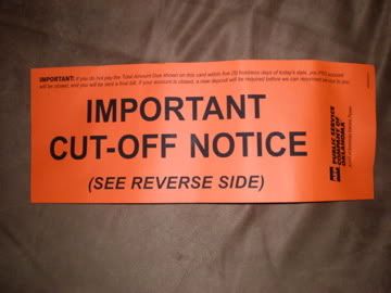 Yes, that's right, my electricity got turned off today. Not because I didn't have the money to pay my bill, but because I was just too lazy to actually pay it.